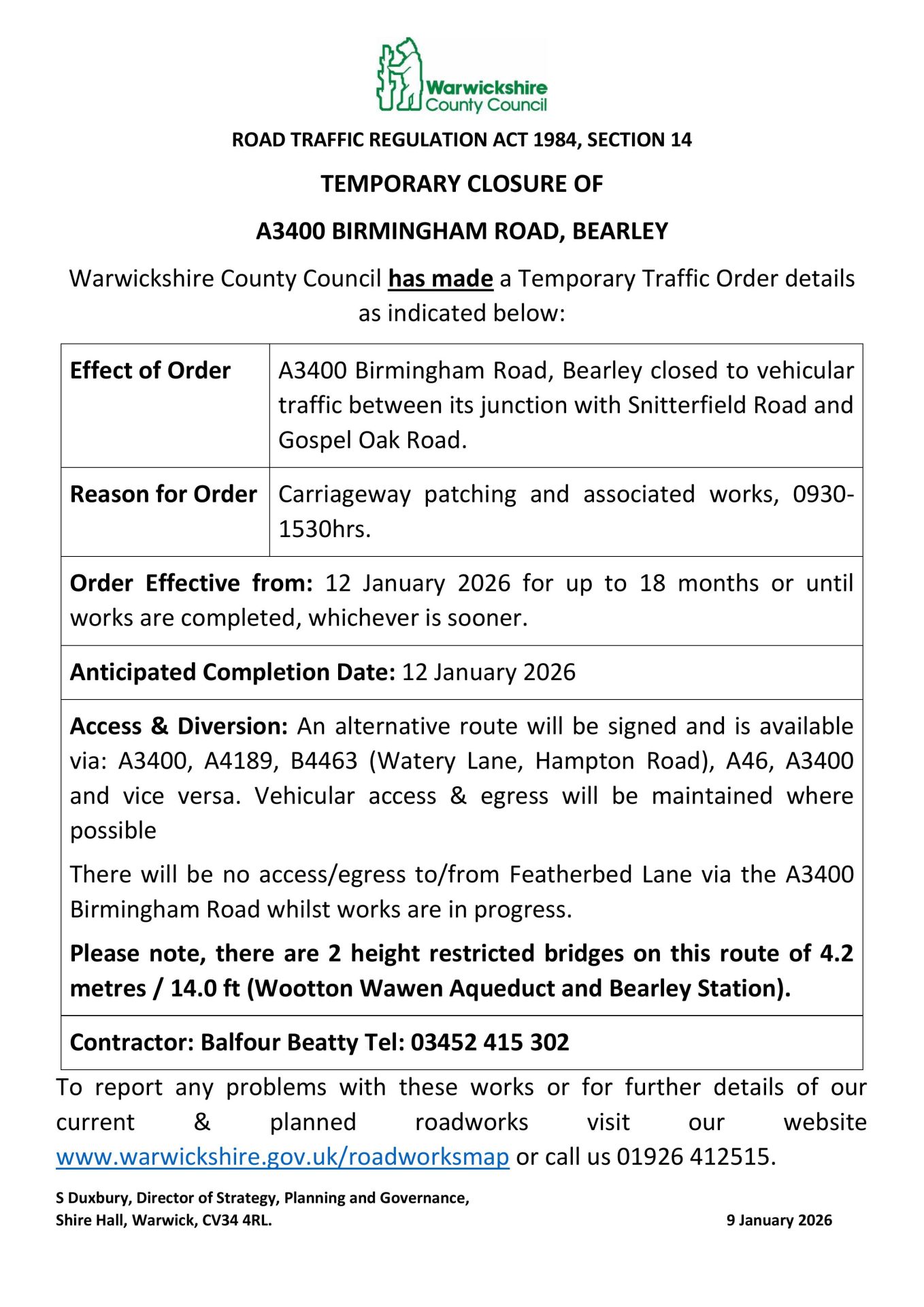 Warwickshire County Council have advised us of the following temporary road closure on Monday 12 January 2026 on the A3400 Birmingham Road, Bearley for carriageway patching and associated works from 09:30am to 15:30pm. Site notice and diversion plan can be seen below.